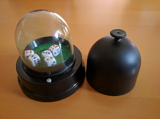 Wer die Spannung bis ins schier unerträgliche erhöhen möchte, verdeckt das Ergebnis mit der beiliegenden Abdeckhaube aus schwarzem Koschbasalt (na gut: Plastik), um so die Spielrunde auf die Folter zu spannen. Wer es aber nicht aushalten kann, lässt Abdeckung Abdeckung sein und startet die Maschine einfach so. Hei, wie die Würfel fein umhertanzen!