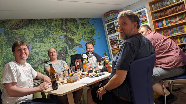 | Die vier Helden und der Schelm bei der ersten Spielrunde im neuen Keller |